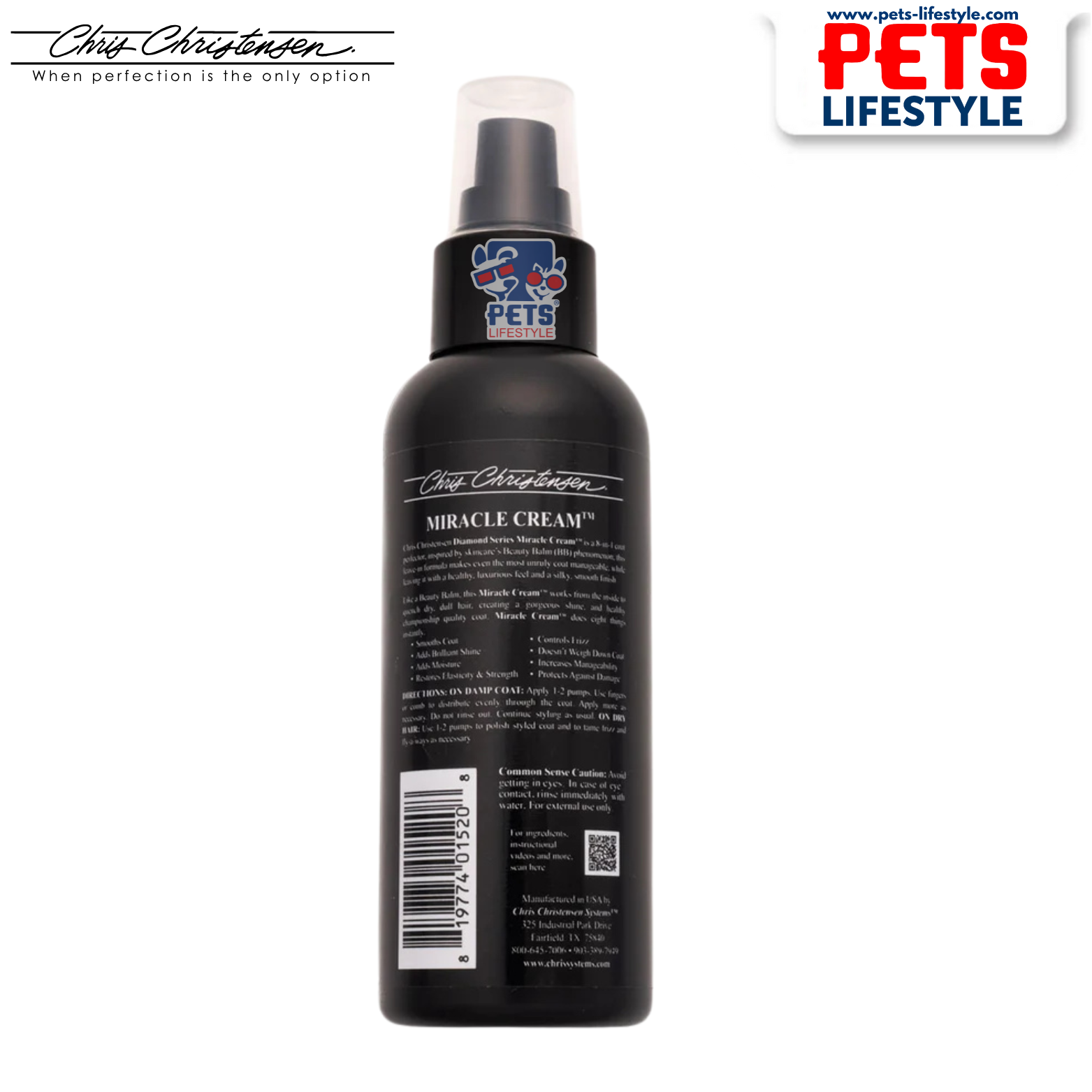 Chris Christensen Diamond Series Miracle Cream is a revolutionary 8-in-1 leave-in coat perfecter designed to make even the most unruly coats beautifully manageable, sleek, and soft. This lightweight, professional-grade formula delivers deep nourishment, restores smoothness, tames frizz and flyaways, and imparts a radiant, silky finish.