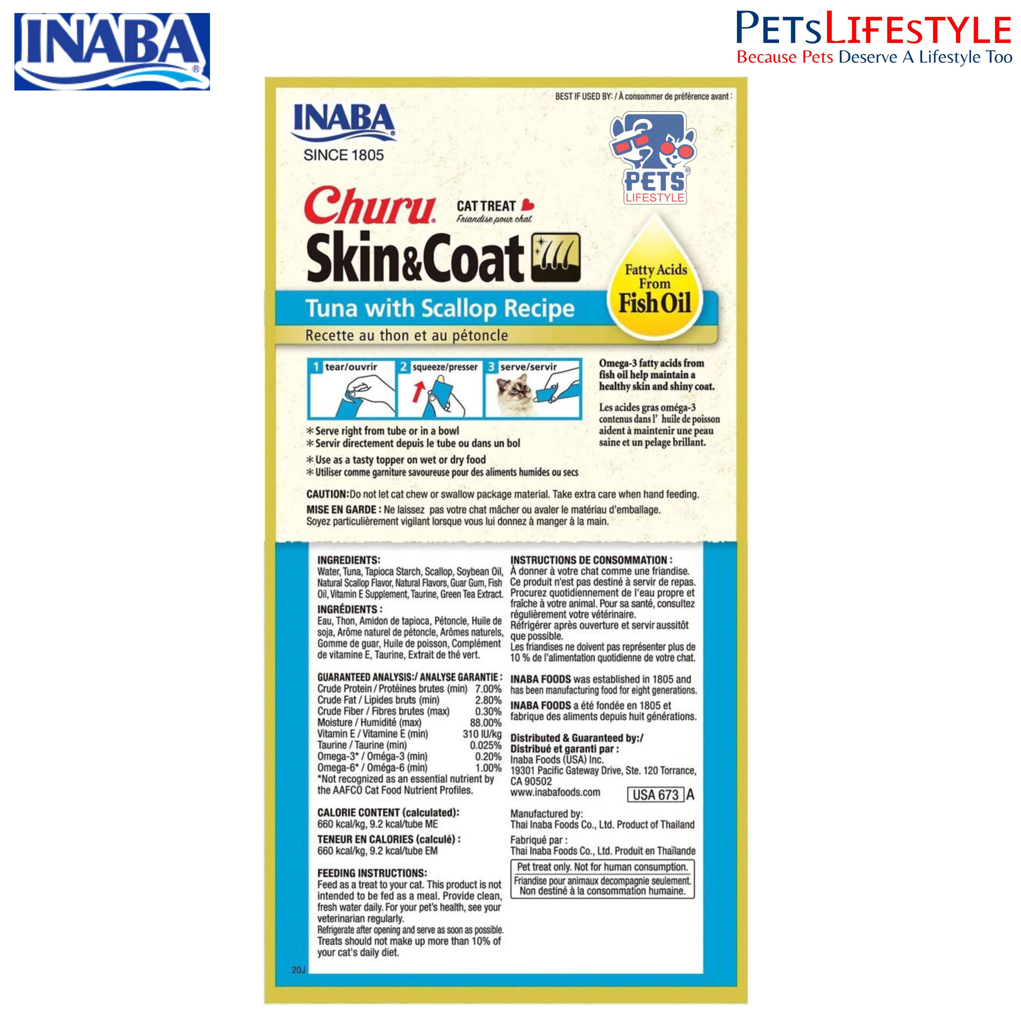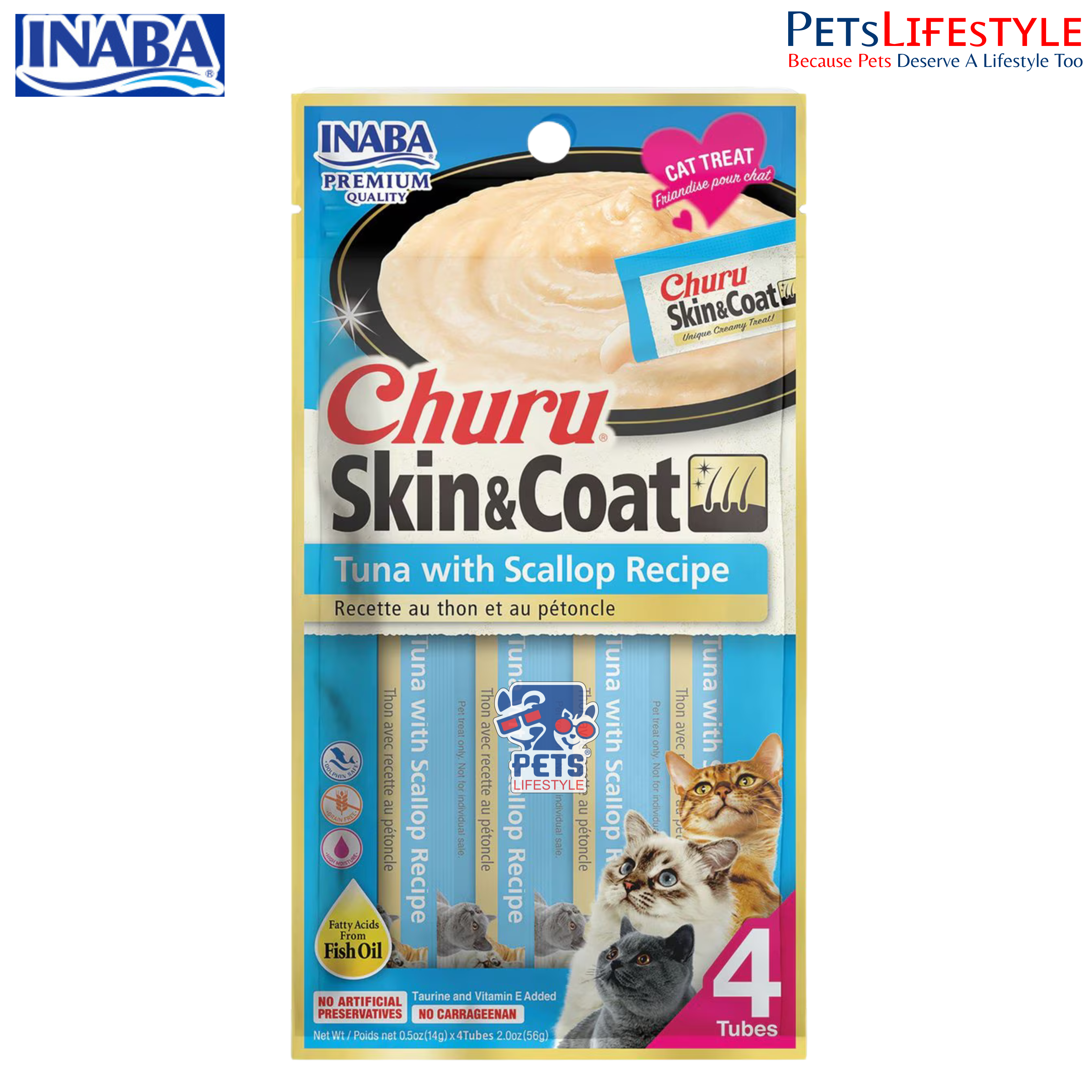 Churu Skin & Coat Tuna with Scallop Recipe is a premium lickable cat treat crafted to support your feline's skin health, hydration, and overall wellness. Made using 100% real wild-caught tuna and scallop, this creamy high-moisture texture treat delivers irresistible taste while providing essential Omega fatty acids for a soft, shiny coat.