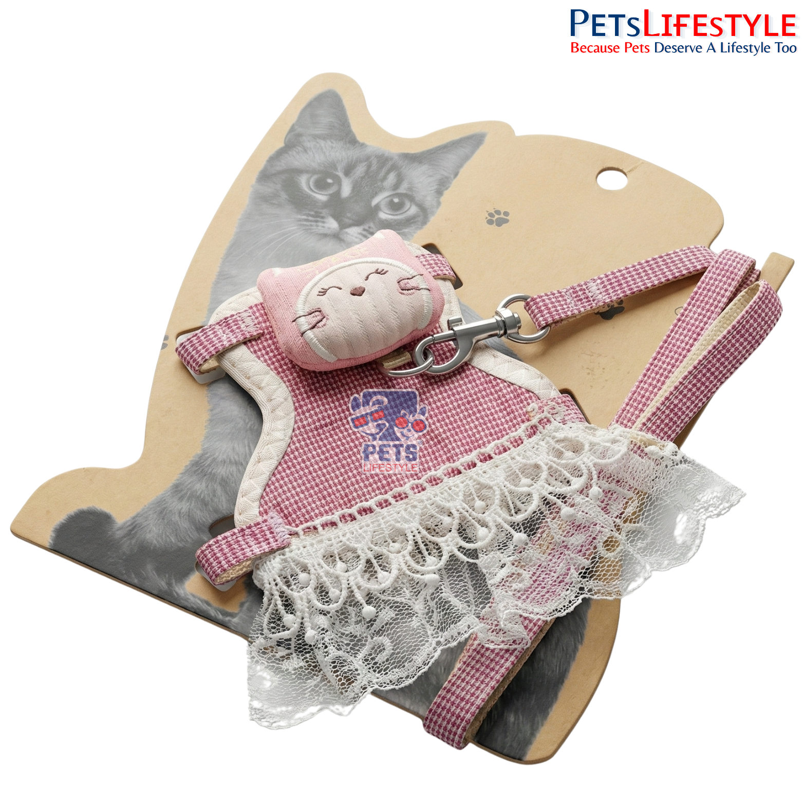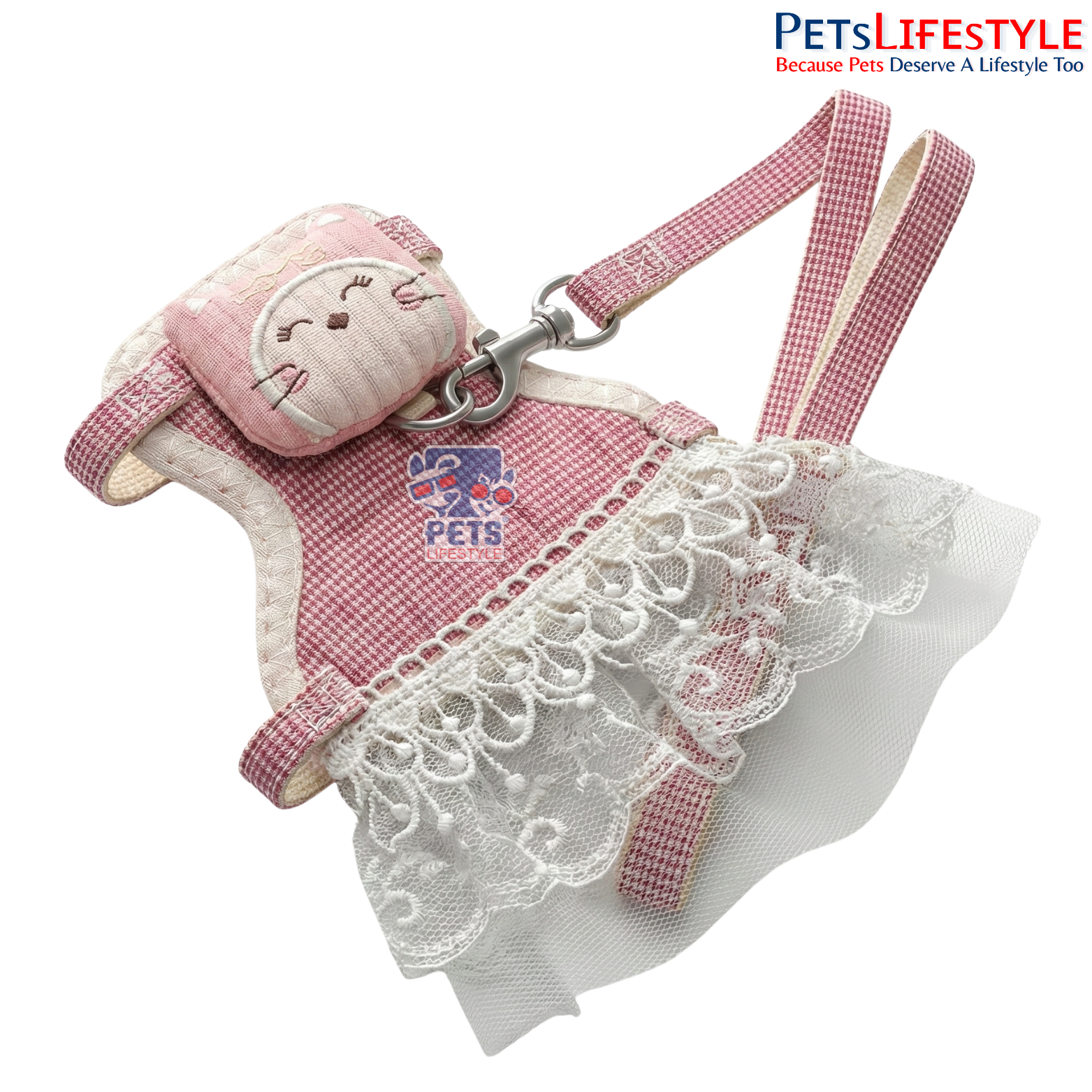 The vest-style harness features a charming plaid pattern, elegant lace trim, and cute decorative detailing on the chest, giving your pet a fashionable, dress-like appearance that stands out during walks, travel, special occasions, and photo shoots.