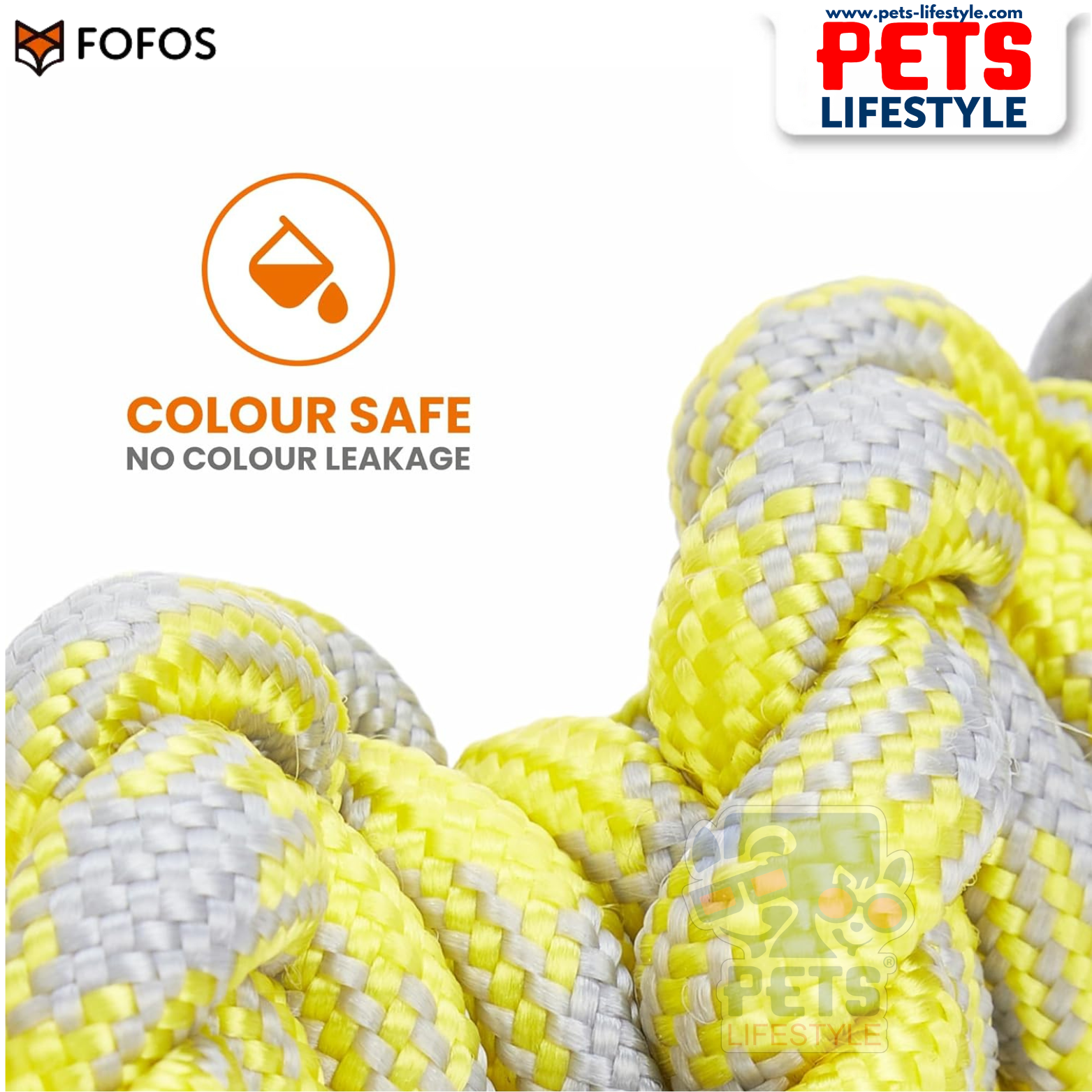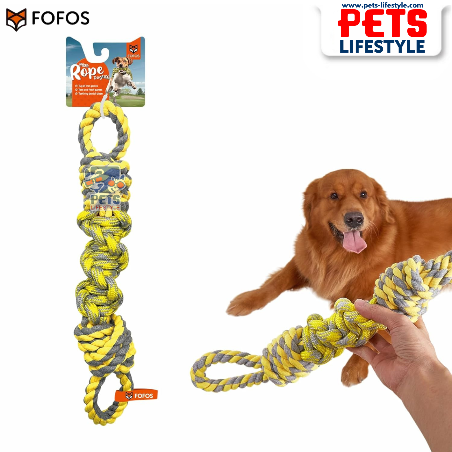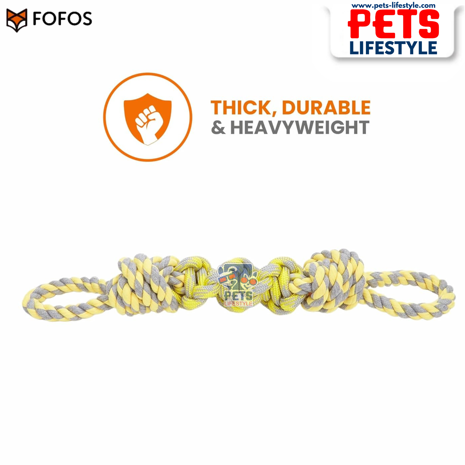 The FOFOS Flossy Rope Dog Toy Yellow/Grey is a durable woven rope toy designed to provide powerful chewing satisfaction while supporting your dog’s dental health. Made with colourfast fibres visible to dogs, this toy is engineered for tugging, pulling, chewing, and interactive play.