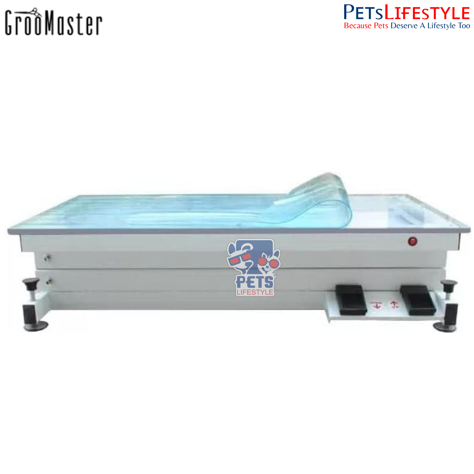 To support stability on any grooming studio floor, the table includes adjustable leveling feet, ensuring a balanced and vibration-free workspace. The integrated leash-holding arms offer secure pet handling, improving safety and precision during grooming.