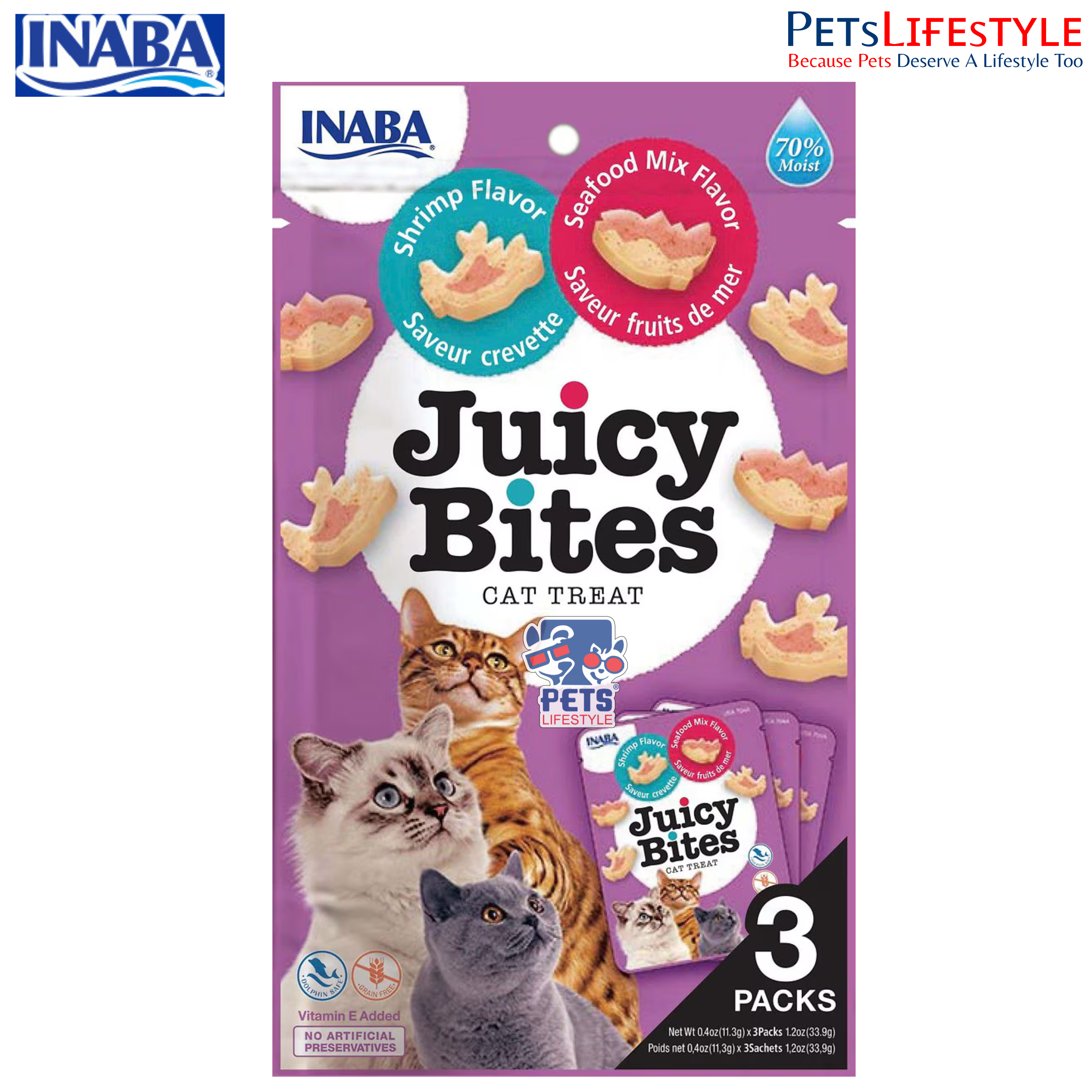 Juicy Bites Shrimp & Seafood Mix Flavor are soft, moist bite-sized cat treats crafted with real seafood to deliver an irresistible taste experience. Made with 100% pure and natural wild-caught tuna and farm-raised chicken, these treats offer premium nutrition in every bite. With added moisture for hydration, no grains, preservatives, or artificial coloring, this treat is perfect for picky eaters, training, and rewarding. Each pack contains individually sealed pouches to ensure maximum freshness, aroma, and softness.