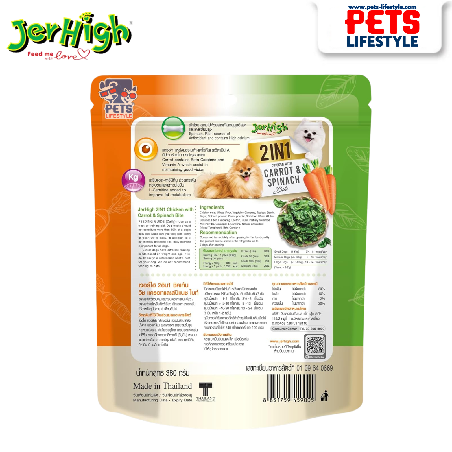 JerHigh 2in1 Chicken Bites combine delicious, real chicken with the natural goodness of carrots and spinach. Carrots are rich in beta-carotene and vitamin A, which support healthy vision. Spinach offers antioxidants and high calcium content to aid overall health. Fortified with L-Carnitine to promote efficient fat metabolism, this treat provides both taste and nutrition in one bite.