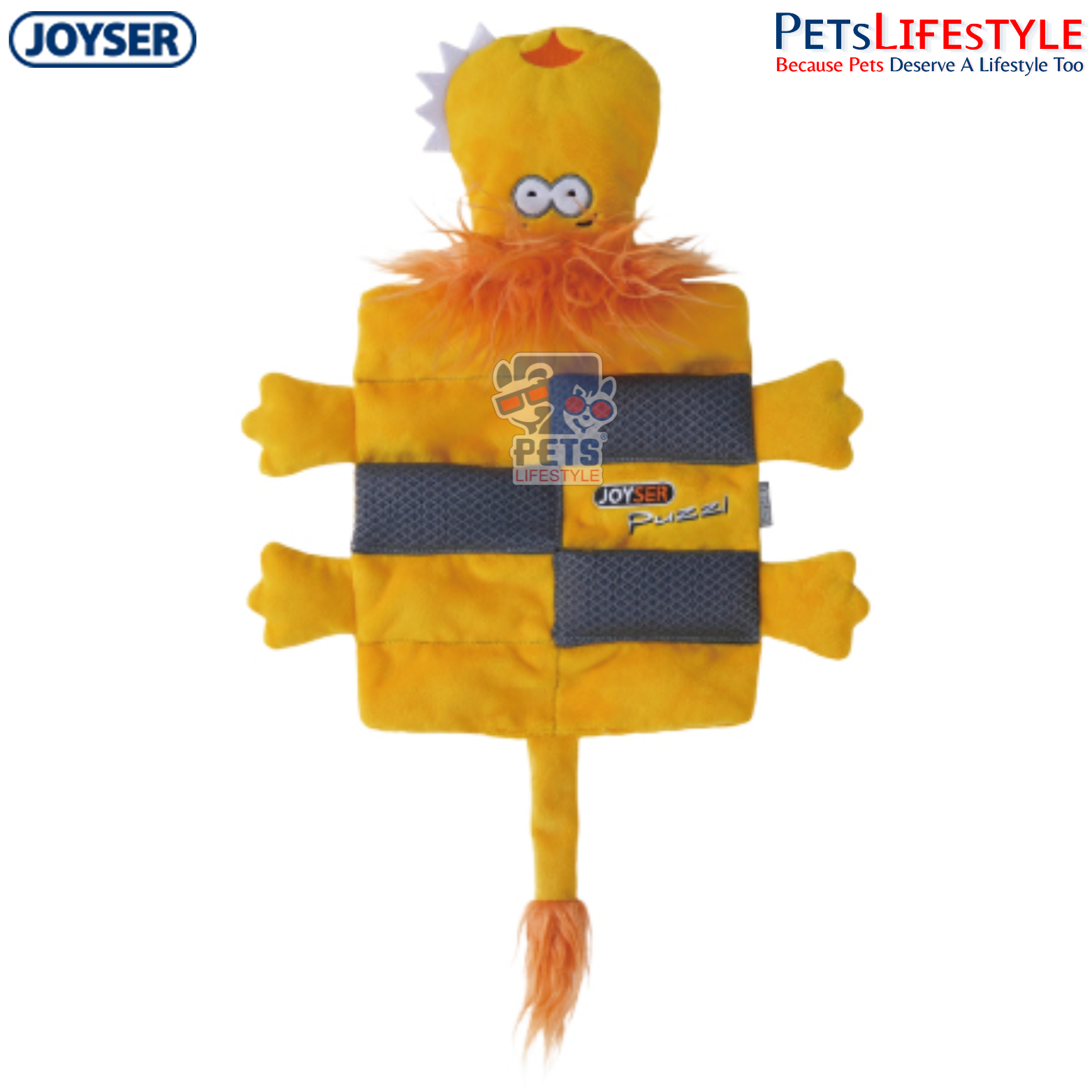 The JOYSER Puzzle Lion – Yellow (S/M) is a character-driven enrichment toy created for dogs that love squeaky, interactive plush toys. Styled as a cheerful lion with expressive eyes, plush snout, friendly smile, and a luxurious faux-fur mane, this toy instantly captures your dog’s attention.