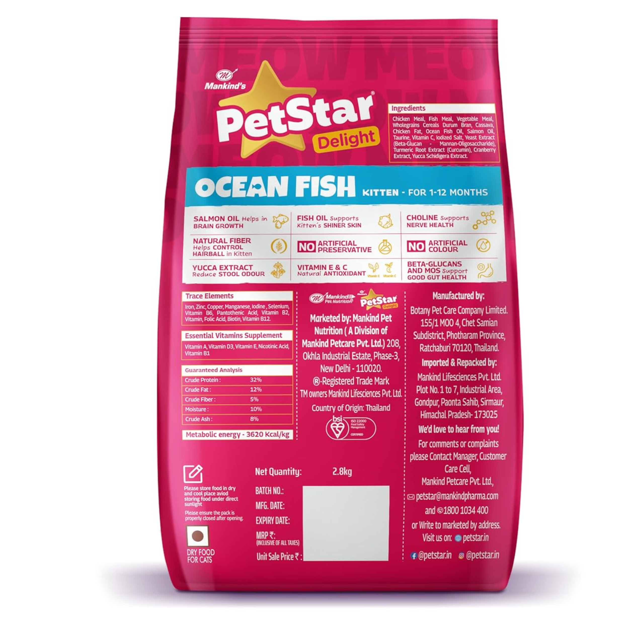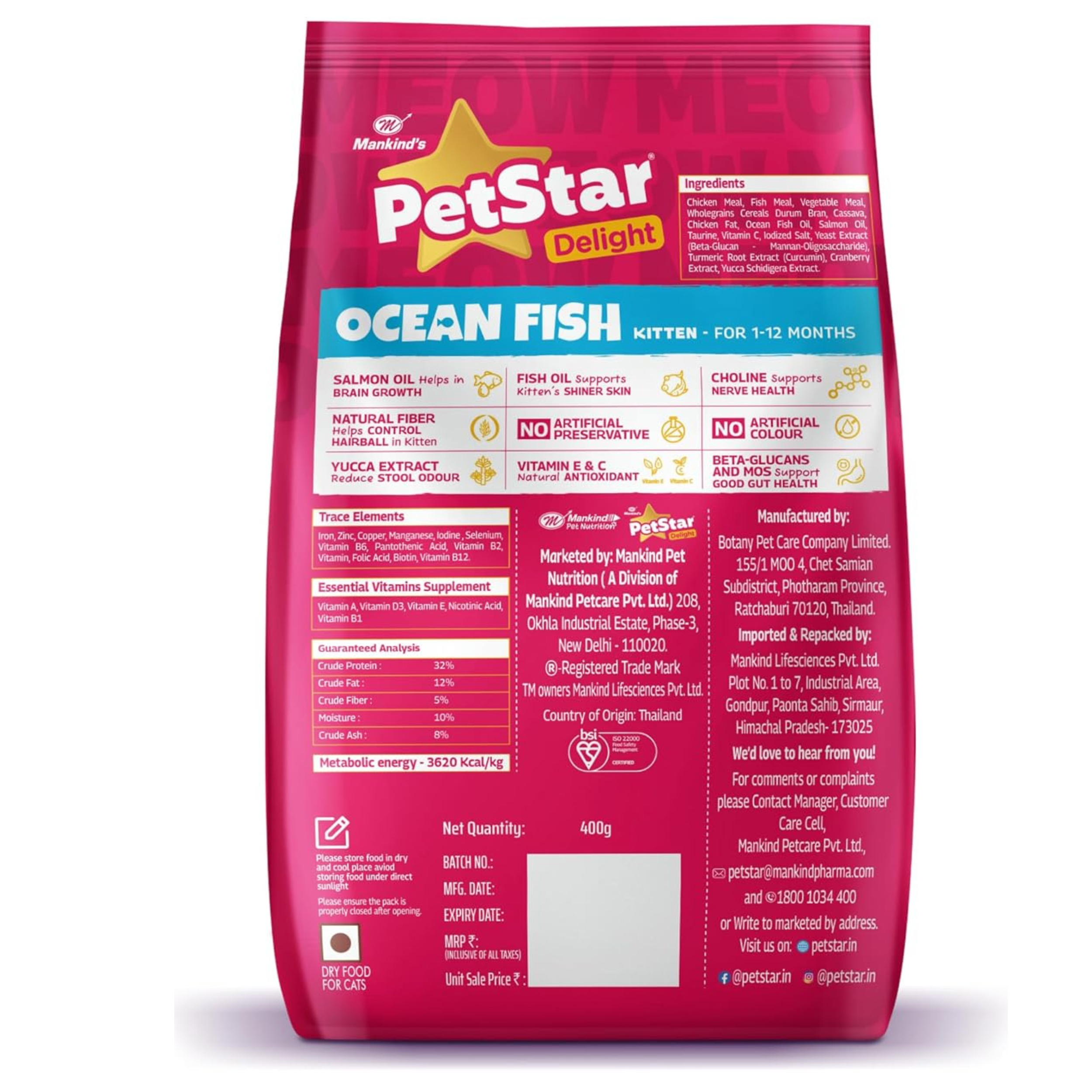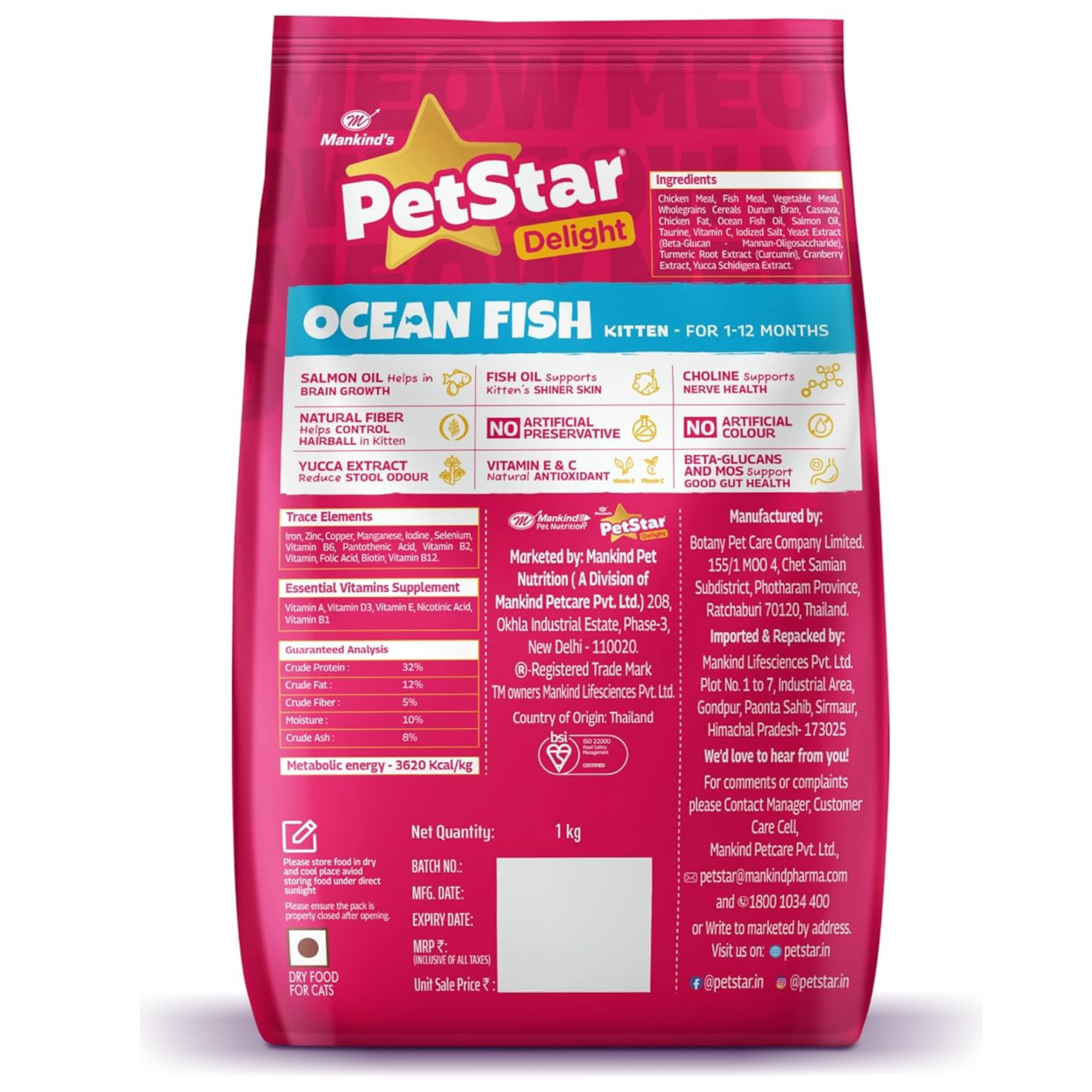 Mankind PetStar Kitten Cat Food – Ocean Fish Flavour is a complete and balanced nutrition formula specially designed for kittens aged 1 to 12 months. Developed to support rapid growth and early development, this protein-rich diet provides essential nutrients required for strong bones, healthy muscles, brain development, and overall vitality during the most important growth phase of your kitten’s life.