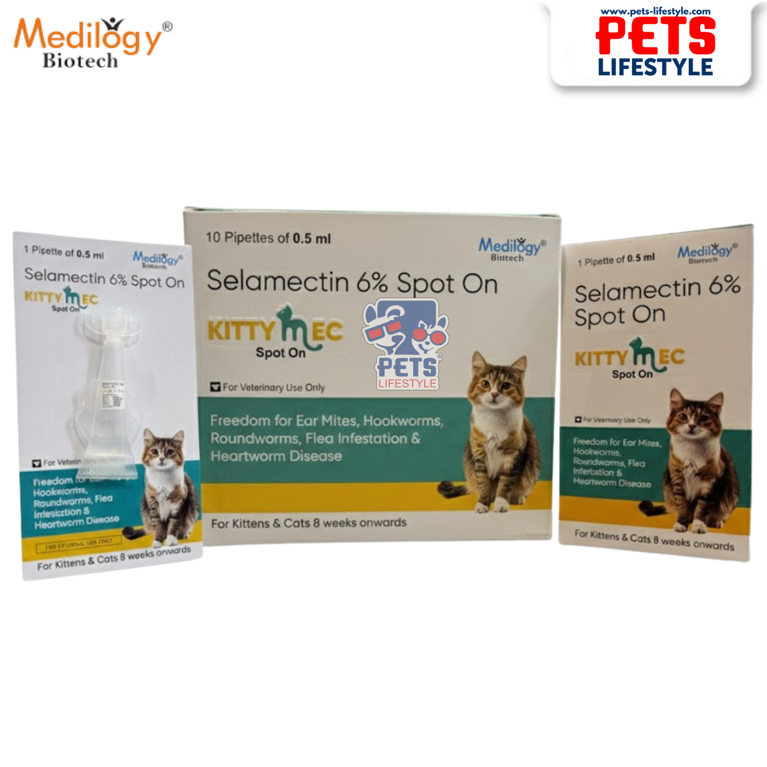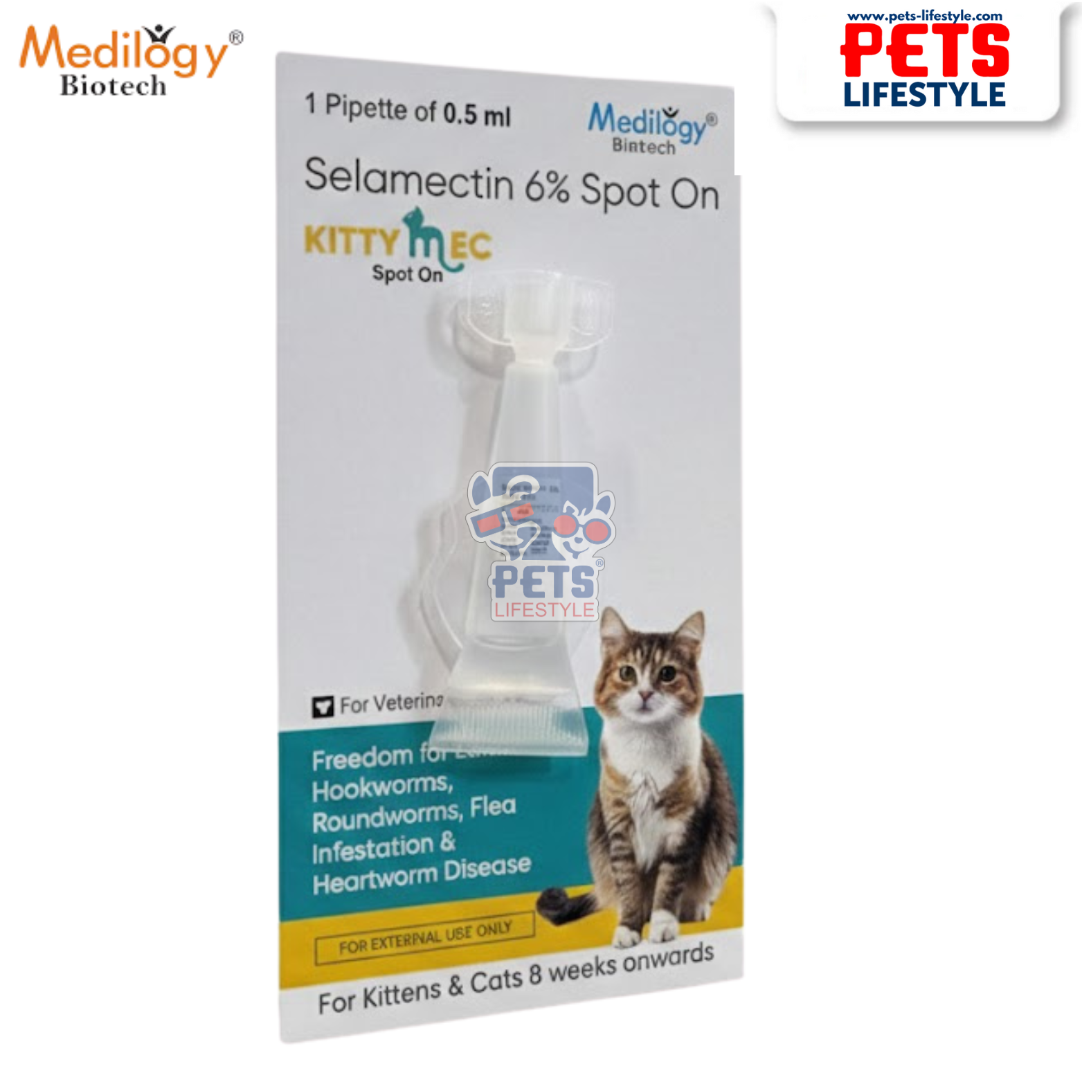 KITTY EC Spot On is a veterinary antiparasitic treatment formulated with Selamectin 6%, designed to provide broad-spectrum protection against internal and external parasites in cats and kittens. Manufactured by Medilogy Biotech, this topical endectocide delivers convenient, effective parasite control with a single spot-on application.