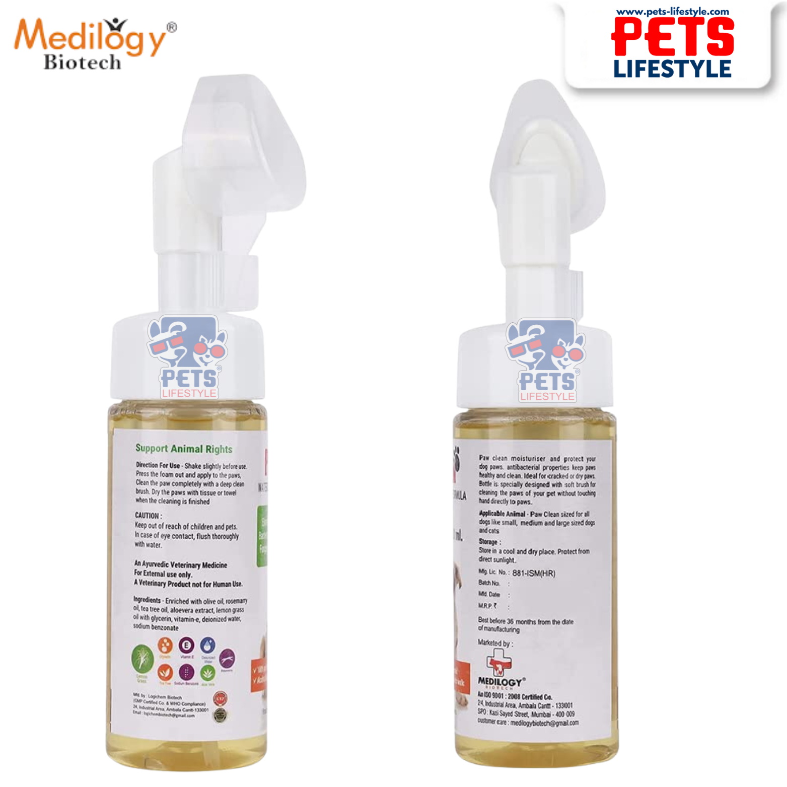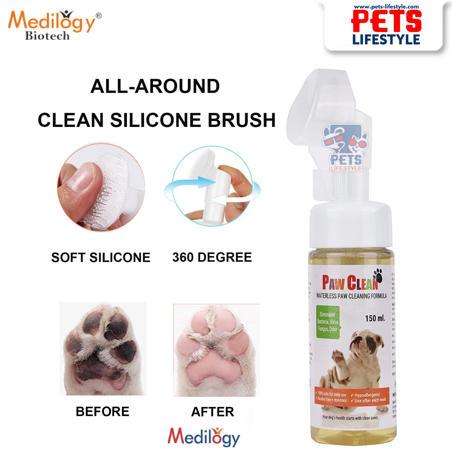 Keep muddy paw prints out of your home and car with Medilogy Paw Clean Waterless Paw Cleaning Shampoo, a convenient no-rinse paw hygiene solution from Medilogy Biotech. Specially designed for dogs and cats of all sizes, this portable paw cleaner combines a gentle cleansing solution with soft silicone bristles that help loosen and remove dirt, mud, sand, and environmental contaminants from your pet’s paws.