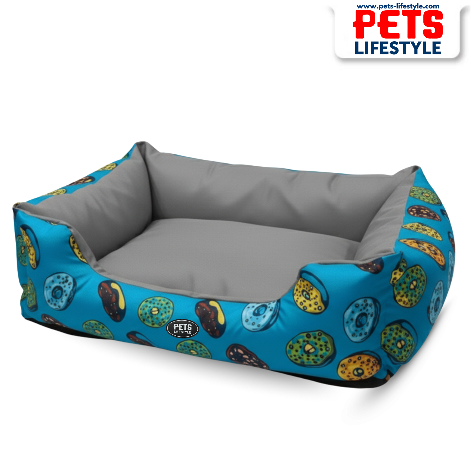 Treat your furry companion to a cozy and playful resting spot with the PᴇᴛsLɪғᴇsᴛʏʟᴇ Donut Pattern Blue & Grey Dog Bed. This round, donut-shaped lounger is designed with raised, bolstered edges, creating a secure nest-like environment that pets love to curl up in. The exterior features a vibrant blue background adorned with colorful, cartoon-style donut patterns, adding a fun and stylish accent to your home.