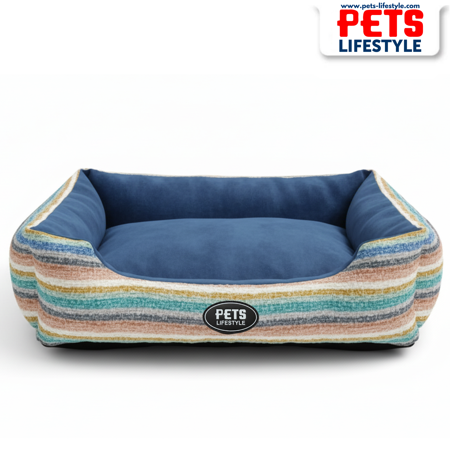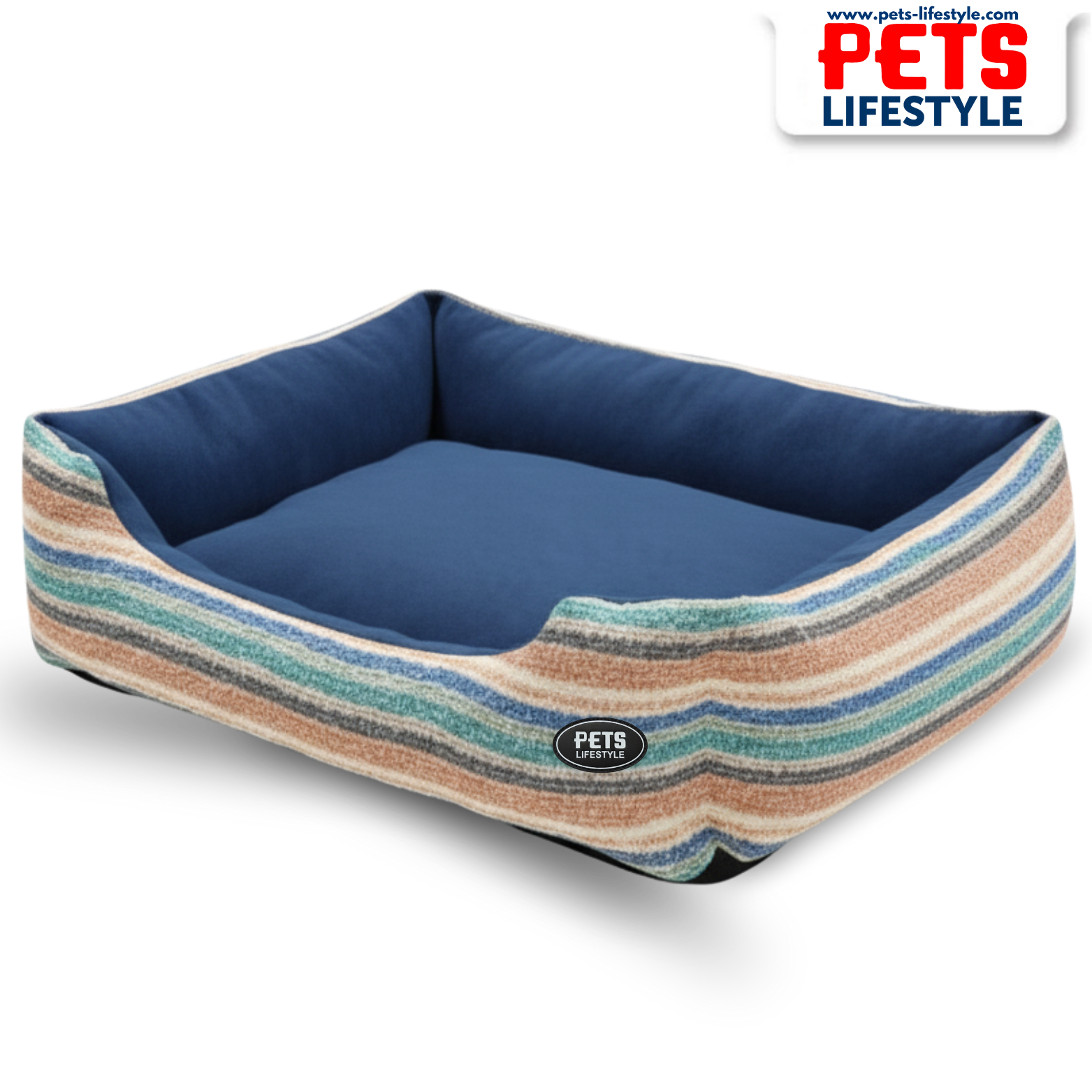 The central sleeping area is a deep, plush blue cushion that provides orthopedic support and plush comfort. The exterior features a stylish striped woven design in shades of blue, brown, grey, and off-white, blending elegance with practicality. Crafted from soft fabrics, this bed is designed to be both durable and gentle on your pet’s skin, ensuring a restful and safe sleep environment.
