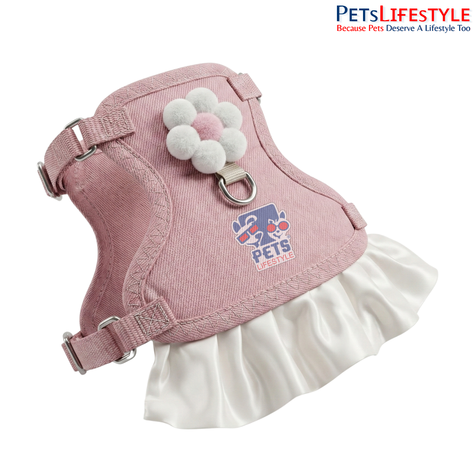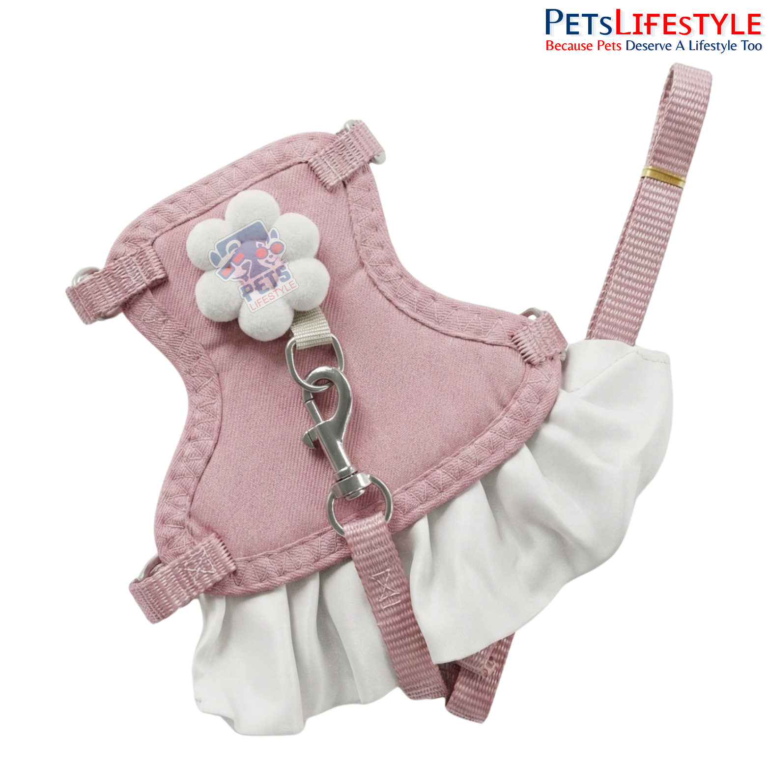 Cute dress-style pink harness with ruffles & flower accent