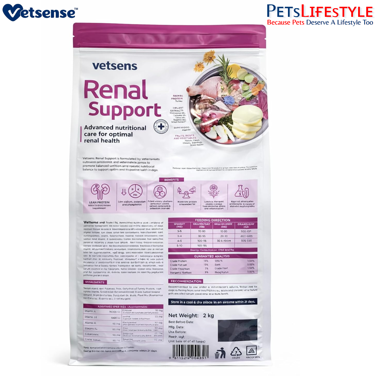 Vetsens Renal Support Dog Food is a veterinary-formulated complete and balanced diet designed to support dogs with renal concerns, including chronic kidney conditions and urinary health management. Developed by veterinarians and animal nutrition experts, this formula helps maintain metabolic balance while reducing stress on the kidneys.