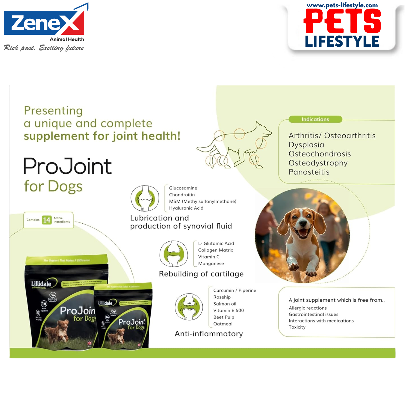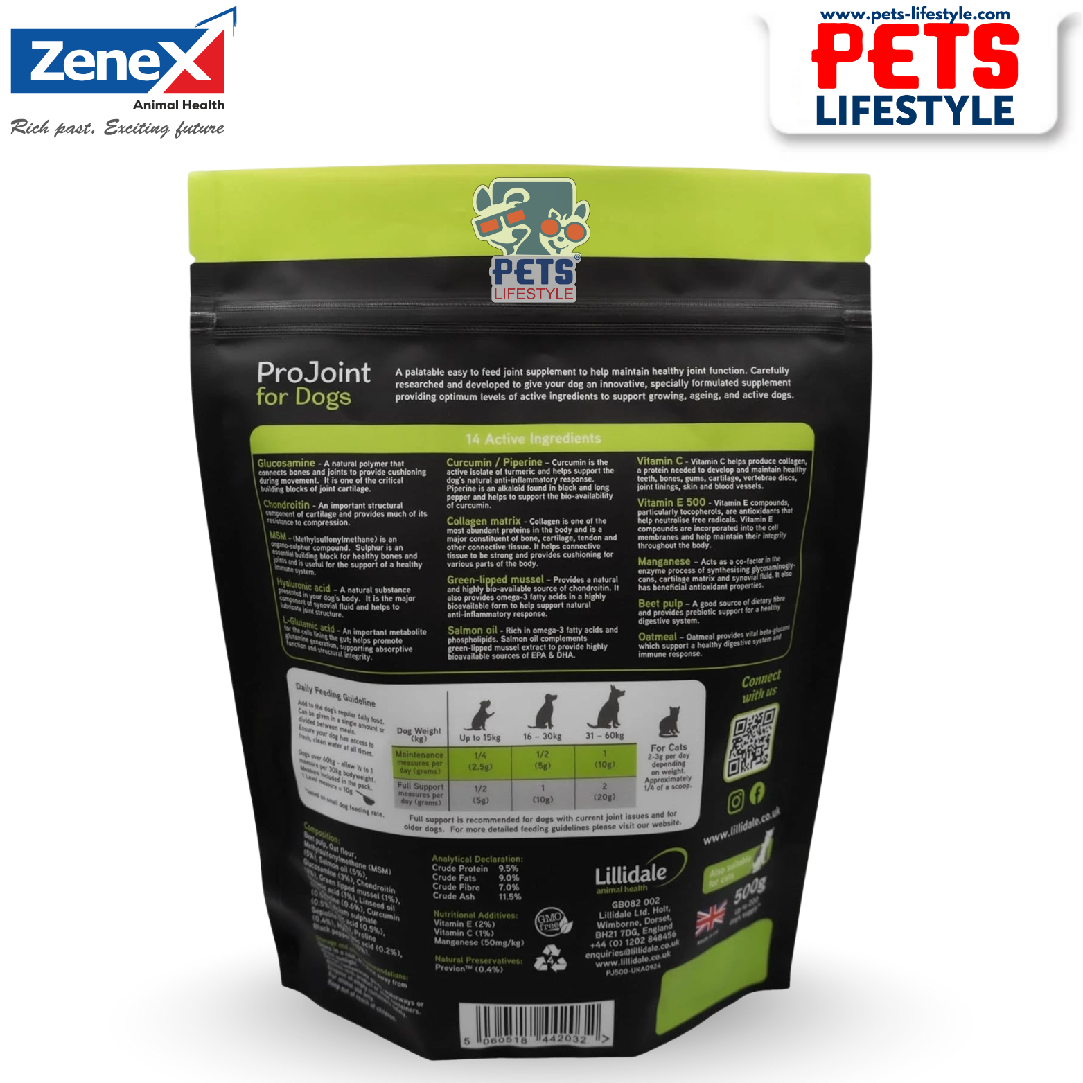 ProJoint by Lillidale Animal Health is a scientifically formulated, palatable joint supplement designed to maintain and support optimal joint function in growing, active, working, and aging dogs. Developed in the UK, it combines 14 powerful active ingredients that help protect cartilage, reduce stiffness, and promote free movement.